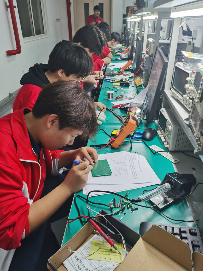 实训期间,张进老师以“理论+实操”相结合的模式,围绕电子专业核心技能开展教学。从电子元器件识别与检测、基础电路焊接,到简单电子设备组装与调试,张老师通过示范讲解、手把手指导,帮助学生将课堂所学转化为实际操作能力。学生们分组协作、动手实践,在电路板前专注焊接、认真排查故障,现场学习氛围浓厚。
