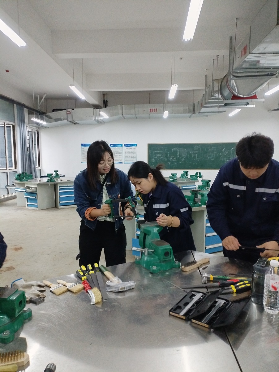 实训过程中,我校机电实训老师袁倩全程教学并指导,从钳工基础的工具使用、零件测量,到锯削、锉削、钻孔等核心操作,她均进行细致演示与手把手教学。针对学生操作中出现的精度偏差、手法不规范等问题,袁老师逐一纠正,确保每位学生都能掌握钳工操作的关键要领,切实提升动手能力。她强调:“钳工是机械制造的基石,讲究的是‘慢工出细活’,精度和耐心缺一不可。大家不仅要学会操作,更要养成严谨细致、追求卓越的工匠精神。”