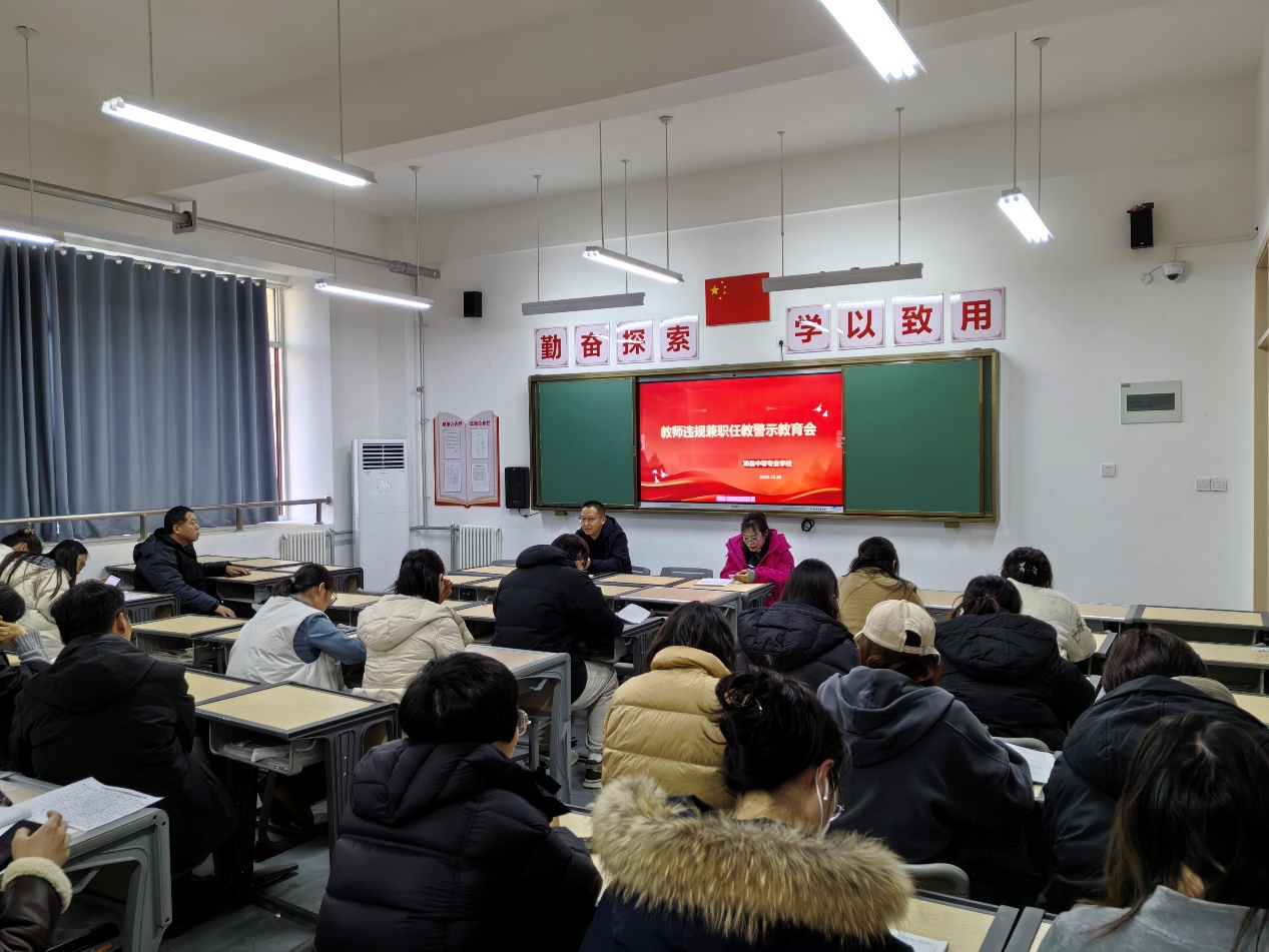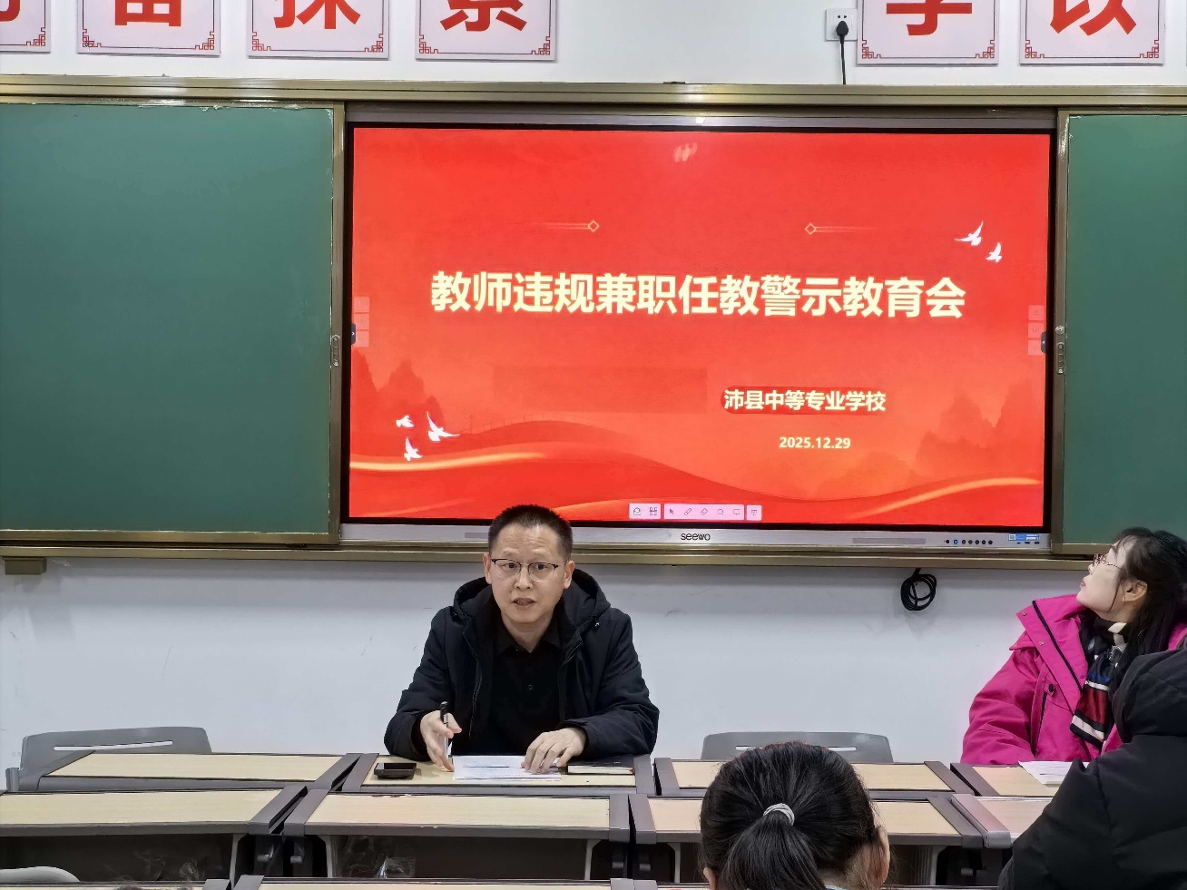 2025年12月29日,沛县中专现代服务系召开教师违规兼职任教警示教育会,全体教师参会,会议由系主任李栋梁主持。
