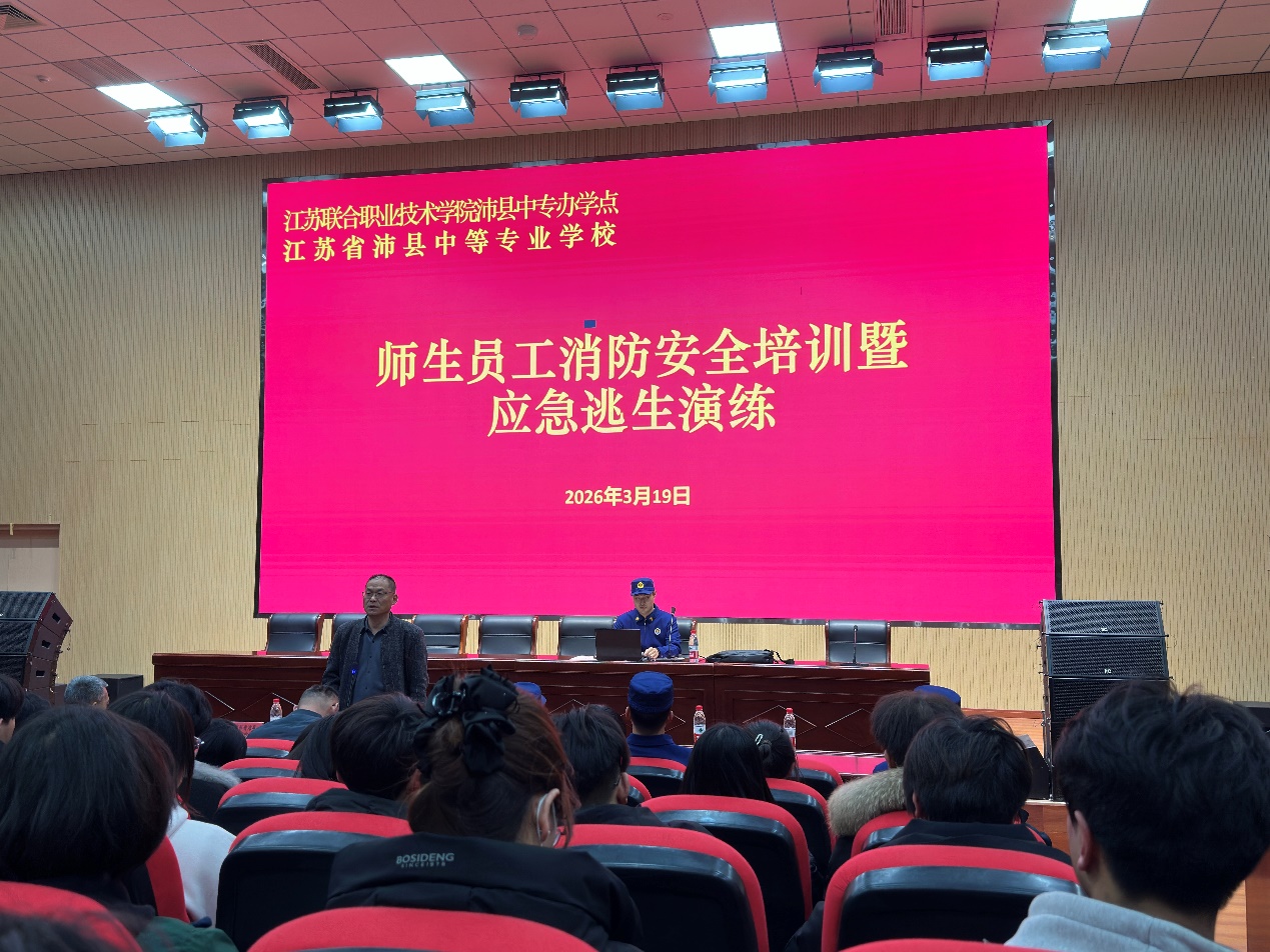 织密安全防护网,筑牢校园“防火墙”。为深入贯彻落实总体国家安全观,切实增强师生员工的消防安全意识与应急避险能力,2026年3月19日下午,江苏省联合职业技术学院沛县中专办学点、江苏省沛县中等专业学校严格按照上级部门要求,精心组织开展了2026年消防安全培训暨应急逃生演练活动。此次活动,也是学校全民国家安全教育日系列活动的首场实践环节,本次活动以“筑牢安全防线,青春守护家国”为主题,各系部分管领导、全体班主任及各班级学生干部代表共同参与,躬身实践,沛县消防救援大队官兵应邀到场指导,携手织就校园安全的坚实屏障。