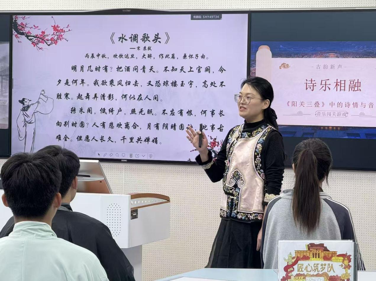 赵志慧老师的音乐课以古典诗词与传统音乐的融合为切入点,通过旋律赏析、歌词解读、节奏体验等多元教学形式,带领学生领略《阳关三叠》中蕴含的深厚友情与家国情怀,让学生在感受传统音乐魅力的同时,增强文化认同感与民族自豪感。