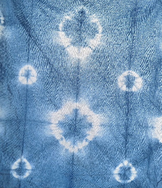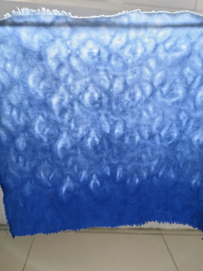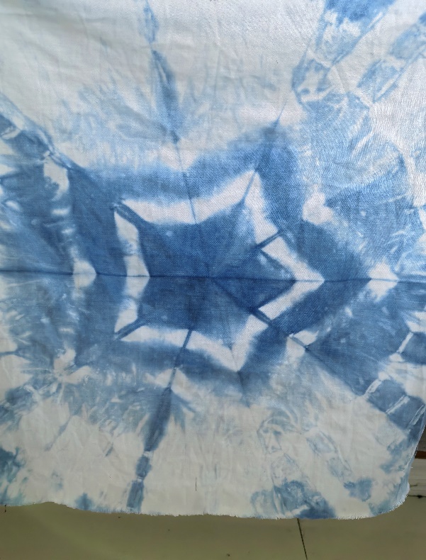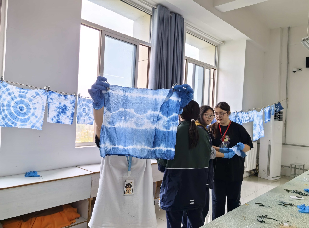 染色环节中,学生们精准控制染料浓度与浸泡时间,看着白布在靛蓝、色彩中逐渐晕染出层次丰富的纹路,现场充满惊喜与欢呼。经过固色、晾晒,四十多件风格各异的扎染作品新鲜出炉,既有传统韵味,又融入现代审美。