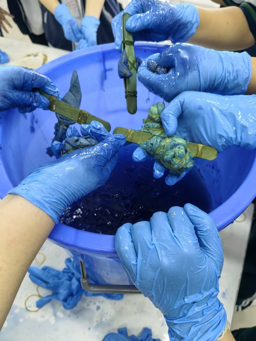 活动伊始,专业老师详细讲解扎染的历史渊源、捆扎技法与染色原理,从螺旋扎、折叠扎到夹染法,手把手指导学生掌握关键技巧。学生们结合纺织专业所学的面料特性知识,挑选纯棉坯布,手持皮筋、夹板等工具,充分发挥创意:有的设计几何图案,有的勾勒花卉纹样,将布料反复折叠、捆扎,注入独特设计巧思。