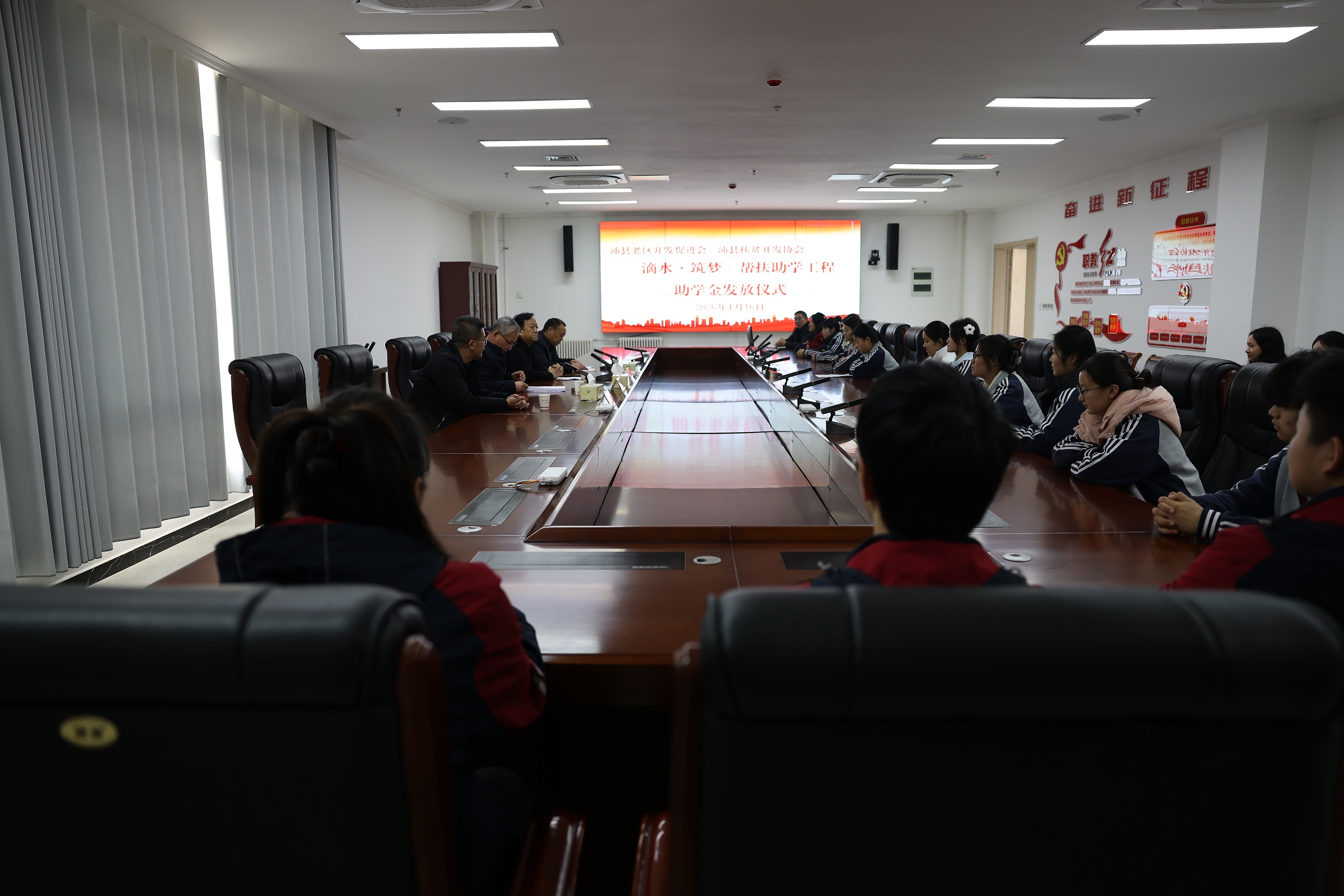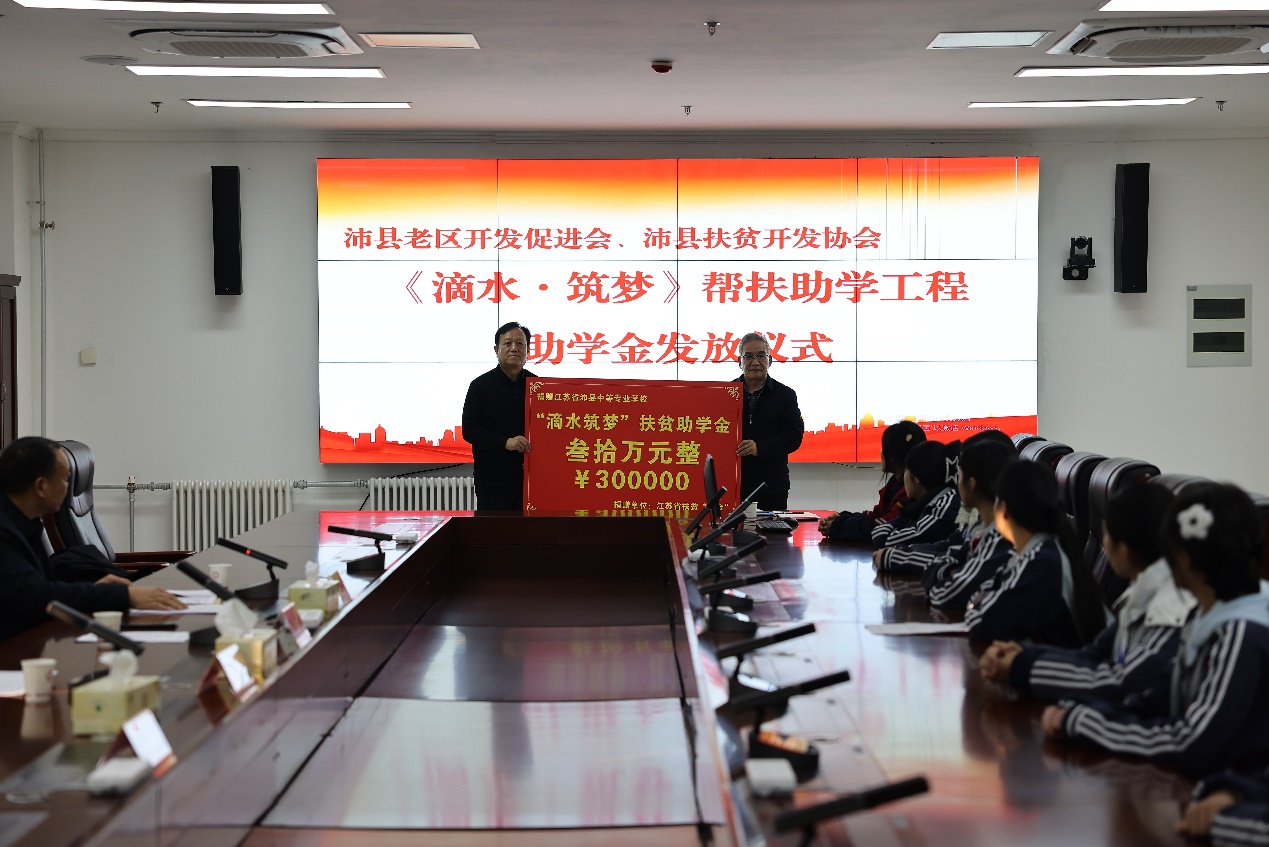 冬日暖情浓,助学润心田,2026年1月16日下午3时,沛县中等专业学校隆重举行“滴水·筑梦”帮扶助学工程助学金发放仪式。沛县老区开发促进会、沛县扶贫开发协会会长李法伟,副会长邵其彬,沛县职业教育学校党委书记、沛县中等专业学校校长王飞,学校党委委员、副校长钟瑞生,招生办主任张洪峰及20名学生代表出席仪式,此次活动凝聚着沛县老区开发促进会、沛县扶贫开发协会会长对职业教育事业的深切关怀,为品学兼优的贫困学子送来冬日里的温暖与希望。仪式由邵其彬副会长主持。