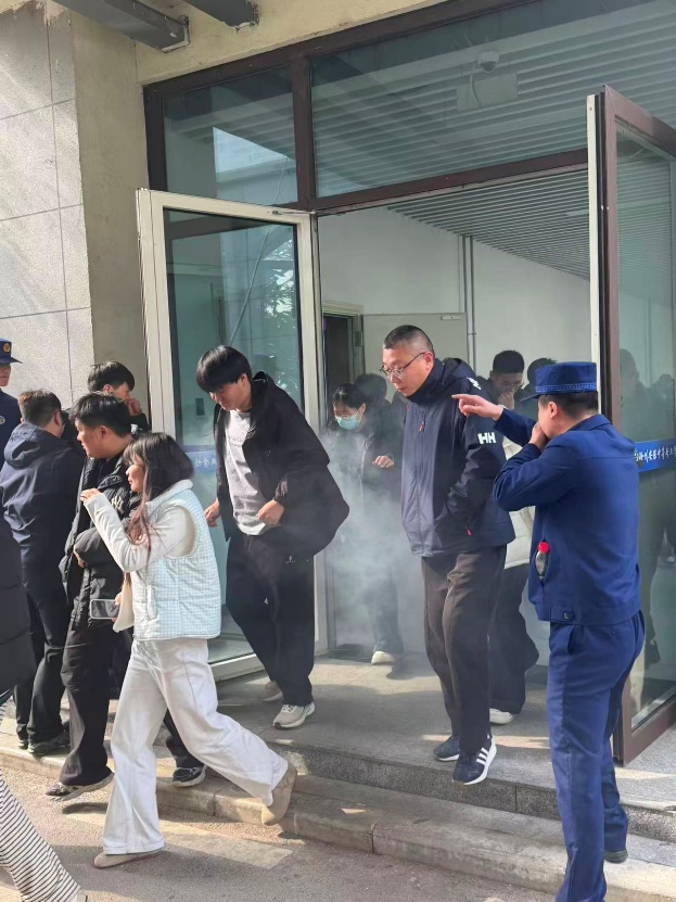 实战演练,锤炼应急“真功夫”。下午15时整,随着一阵浓烟在会议室至安全出口处升腾(模拟烟雾弹释放),刺耳的警报声随即拉响,应急疏散演练正式拉开帷幕。面对突如其来的“火情”,现场工作人员迅速到位,沉着冷静地组织人员疏散。全体参训师生捂住口鼻、弯腰低姿,严格按照预定逃生路线,快速而有序地从会议室撤离,并在极短时间内全部安全集结至A4北侧体育场。整个演练过程组织严密、行动迅速,达到了预期效果。疏散完毕后,现场总指挥对演练情况进行了即时讲评,对疏散过程中的亮点给予肯定,并对存在的细节问题进行了着重分析与指导。躬身疾行于烟雾之中,师生们在实战中锤炼了应急逃生的真本领。
